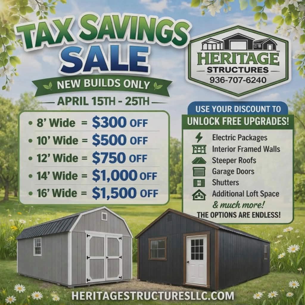 ALL METAL BUILDS 20-25% OFF THE MONTH OF APRIL — PORTABLE BUILDING SALE APRIL 15-25